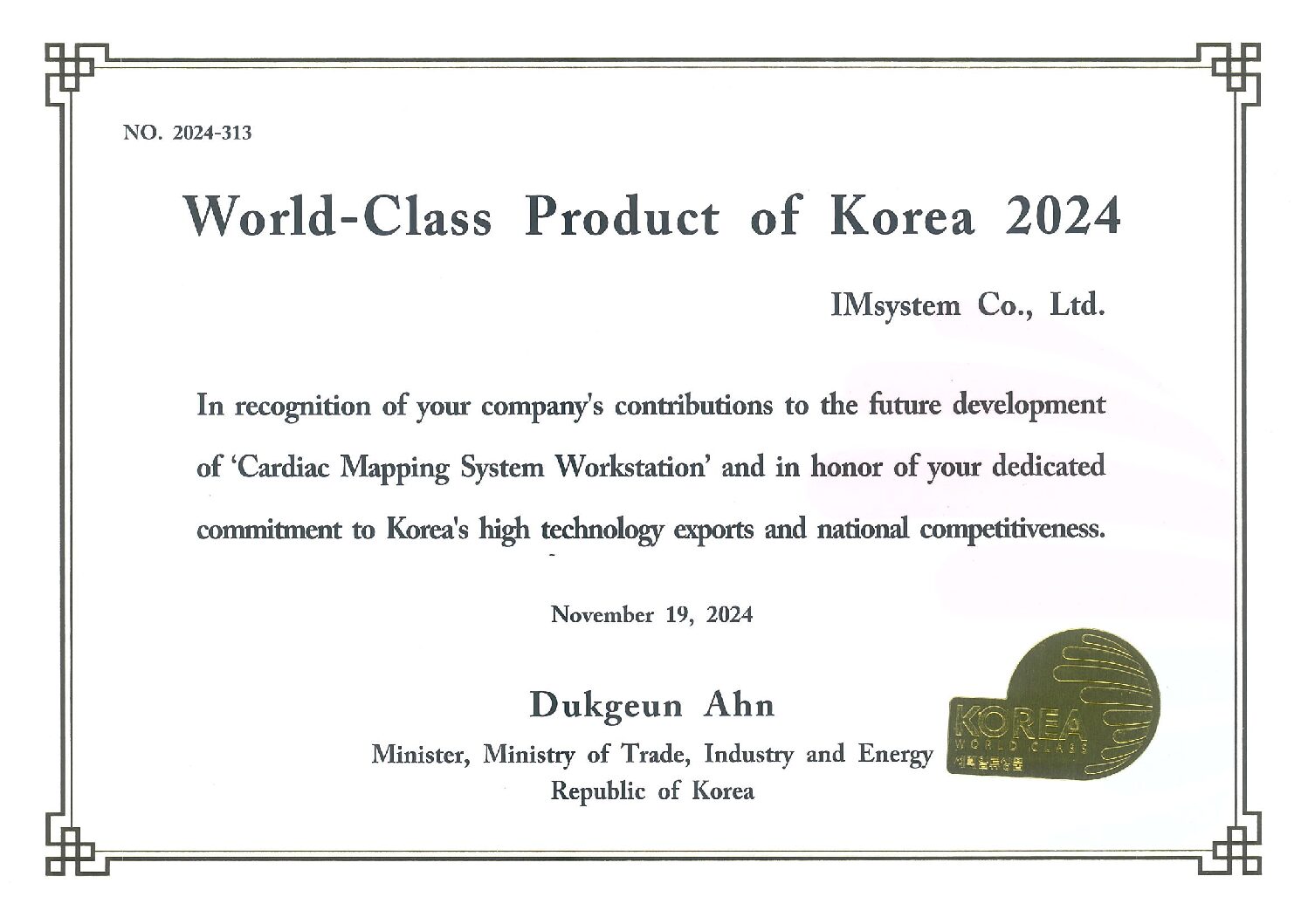 Certificate for World-Class Product of Korea 2024
